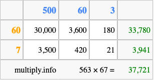 That's all there is to it! As you can see from the box above, the answer to 563 times 67 using the box method is 37,721.