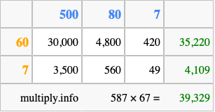 Finally, we add up all the sums we found in step 3 to get our final answer to 587 times 67.