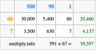 Below is an illustration showing you how to calculate 591 times 67 using the box method, using the instructions above.