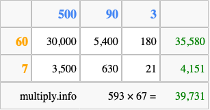 Below is an illustration showing you how to calculate 593 times 67 using the box method, using the instructions above.