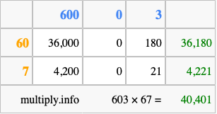 Below is an illustration showing you how to calculate 603 times 67 using the box method, using the instructions above.