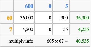 Finally, we add up all the sums we found in step 3 to get our final answer to 605 times 67.