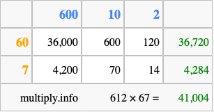 Finally, we add up all the sums we found in step 3 to get our final answer to 612 times 67.