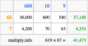 Finally, we add up all the sums we found in step 3 to get our final answer to 619 times 67.
