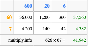 Finally, we add up all the sums we found in step 3 to get our final answer to 626 times 67.