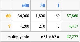 That's all there is to it! As you can see from the box above, the answer to 631 times 67 using the box method is 42,277.