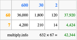 Finally, we add up all the sums we found in step 3 to get our final answer to 632 times 67.