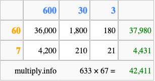 That's all there is to it! As you can see from the box above, the answer to 633 times 67 using the box method is 42,411.