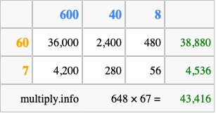 Finally, we add up all the sums we found in step 3 to get our final answer to 648 times 67.