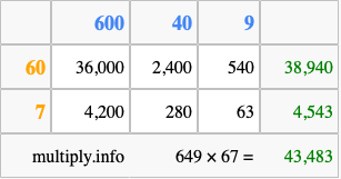 That's all there is to it! As you can see from the box above, the answer to 649 times 67 using the box method is 43,483.