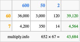 That's all there is to it! As you can see from the box above, the answer to 652 times 67 using the box method is 43,684.