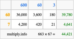 That's all there is to it! As you can see from the box above, the answer to 663 times 67 using the box method is 44,421.