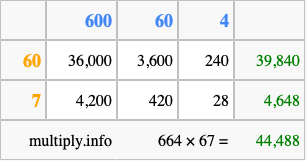 That's all there is to it! As you can see from the box above, the answer to 664 times 67 using the box method is 44,488.