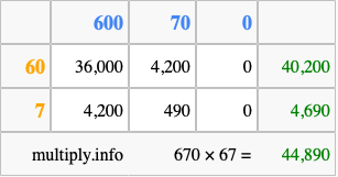 That's all there is to it! As you can see from the box above, the answer to 670 times 67 using the box method is 44,890.