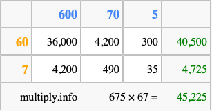 Finally, we add up all the sums we found in step 3 to get our final answer to 675 times 67.