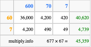 That's all there is to it! As you can see from the box above, the answer to 677 times 67 using the box method is 45,359.