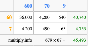 Finally, we add up all the sums we found in step 3 to get our final answer to 679 times 67.