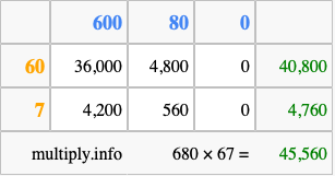 That's all there is to it! As you can see from the box above, the answer to 680 times 67 using the box method is 45,560.