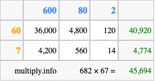 That's all there is to it! As you can see from the box above, the answer to 682 times 67 using the box method is 45,694.