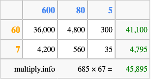 Finally, we add up all the sums we found in step 3 to get our final answer to 685 times 67.