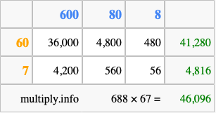 That's all there is to it! As you can see from the box above, the answer to 688 times 67 using the box method is 46,096.