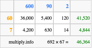 That's all there is to it! As you can see from the box above, the answer to 692 times 67 using the box method is 46,364.
