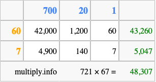Finally, we add up all the sums we found in step 3 to get our final answer to 721 times 67.