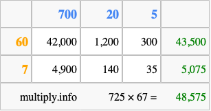 Finally, we add up all the sums we found in step 3 to get our final answer to 725 times 67.
