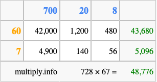 That's all there is to it! As you can see from the box above, the answer to 728 times 67 using the box method is 48,776.