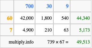 Finally, we add up all the sums we found in step 3 to get our final answer to 739 times 67.
