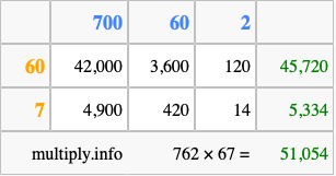 Finally, we add up all the sums we found in step 3 to get our final answer to 762 times 67.