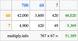 That's all there is to it! As you can see from the box above, the answer to 767 times 67 using the box method is 51,389.