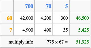 Below is an illustration showing you how to calculate 775 times 67 using the box method, using the instructions above.