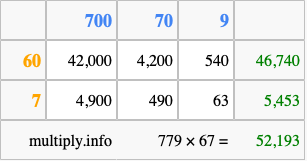 Below is an illustration showing you how to calculate 779 times 67 using the box method, using the instructions above.