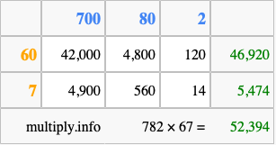 Finally, we add up all the sums we found in step 3 to get our final answer to 782 times 67.