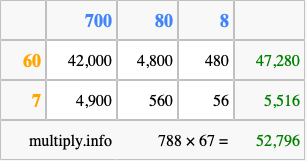 Finally, we add up all the sums we found in step 3 to get our final answer to 788 times 67.
