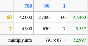 Below is an illustration showing you how to calculate 791 times 67 using the box method, using the instructions above.