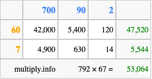 Finally, we add up all the sums we found in step 3 to get our final answer to 792 times 67.