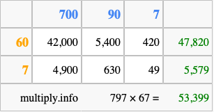 Below is an illustration showing you how to calculate 797 times 67 using the box method, using the instructions above.