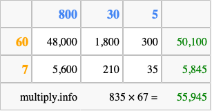 Below is an illustration showing you how to calculate 835 times 67 using the box method, using the instructions above.