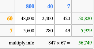 Finally, we add up all the sums we found in step 3 to get our final answer to 847 times 67.