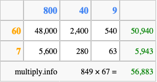 Below is an illustration showing you how to calculate 849 times 67 using the box method, using the instructions above.