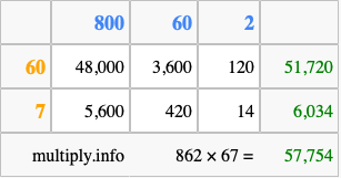Finally, we add up all the sums we found in step 3 to get our final answer to 862 times 67.