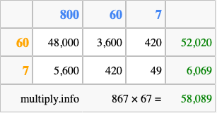 That's all there is to it! As you can see from the box above, the answer to 867 times 67 using the box method is 58,089.