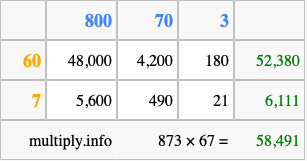 Finally, we add up all the sums we found in step 3 to get our final answer to 873 times 67.