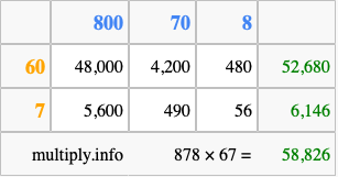 That's all there is to it! As you can see from the box above, the answer to 878 times 67 using the box method is 58,826.