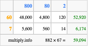 Finally, we add up all the sums we found in step 3 to get our final answer to 882 times 67.