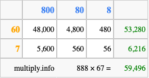 Finally, we add up all the sums we found in step 3 to get our final answer to 888 times 67.