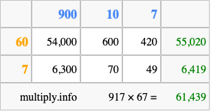 Finally, we add up all the sums we found in step 3 to get our final answer to 917 times 67.
