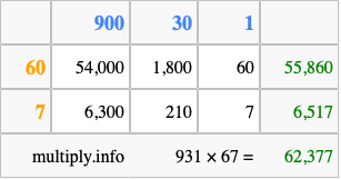 Below is an illustration showing you how to calculate 931 times 67 using the box method, using the instructions above.